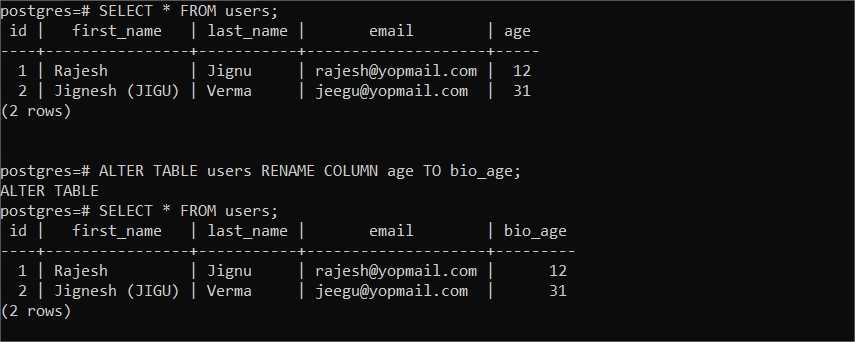 ALTER TABLE table_name RENAME COLUMN prev_column TO new_column;ALTER TABLE users RENAME COLUMN age TO bio_age;DELETE