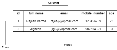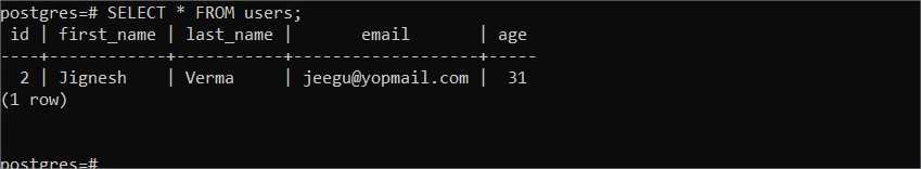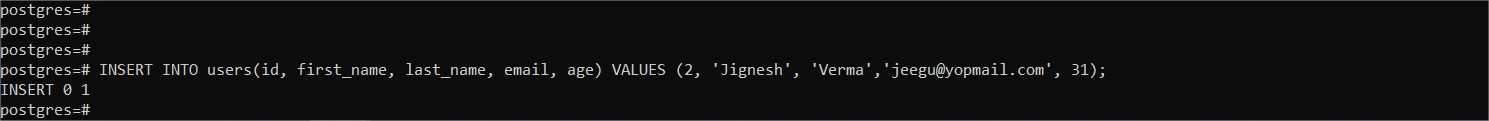 VALUES (value1, value2, …);INSERT INTO users(id, first_name, last_name, email, age) VALUES (2, 'Jignesh', 'Verma','jeegu@yopmail.com', 31);Read