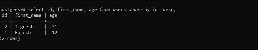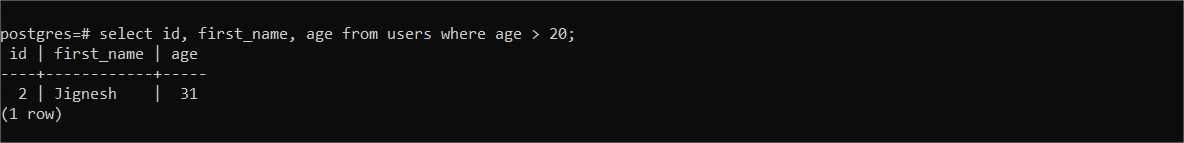 select id, first_name, age from users where age > 20;For sorting, we can use order by column_name DESC and ASC.