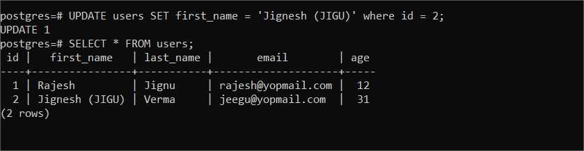 UPDATE table_name SET cloumn = value;UPDATE users SET first_name = 'Jignesh (JIGU)' where id = 2;We can also modify(add, delete or rename) the column with the help of the ALTER statement.