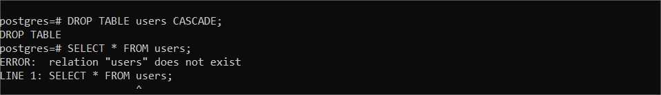 DROP TABLE table_nameDROP TABLE users CASCADE;In the above query we have used cascade keywordto remove all dependent objects first before dropping the user table.