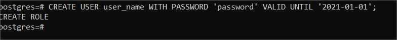 CREATE USER user_name WITH PASSWORD 'password' VALID UNTIL '2021-01-01';