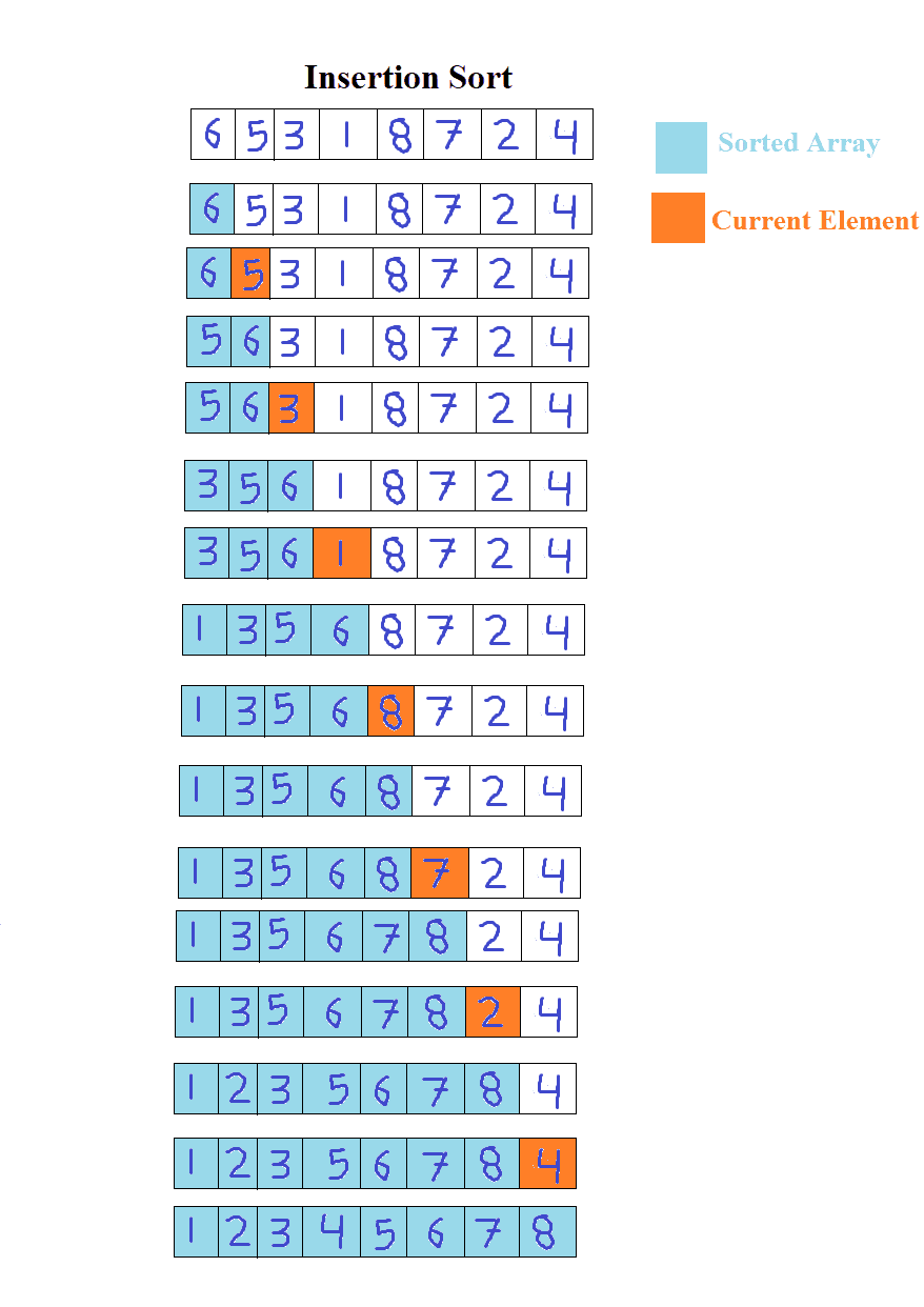Pictorial Representation of how insertion sort will sort the given arrray.